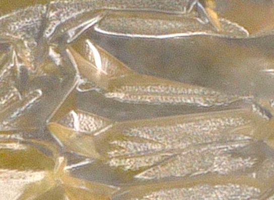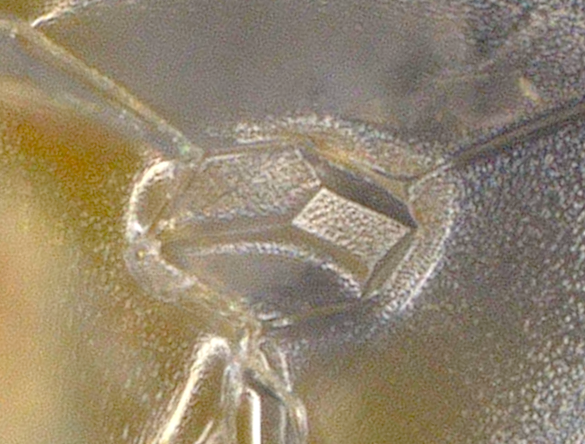 In each of these cases shown below, the crystals appeared to mimic the electronic components and adjacent structures. These shapes of elongated cube-like geometry are normally not seen in xylitol microscopy. This first one looks almost identical to one of the gold-colored contacts on the edge of the SSD module:
