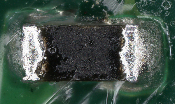 In these higher magnification images, notice the disruption of normal xylitol patterns and the physical structure of "noise" in the following photos, all taken of xylitol on top of or adjacent to electronics components on an SSD module. The two edges of this component are higher than the rest of the component, and xylitol crystals cover the high points:
