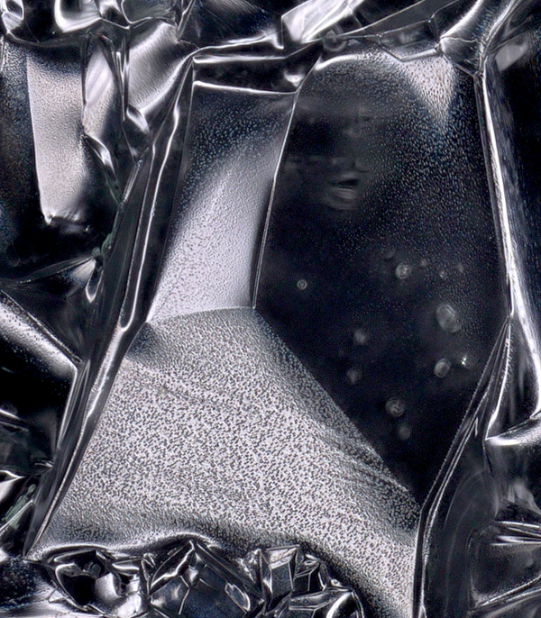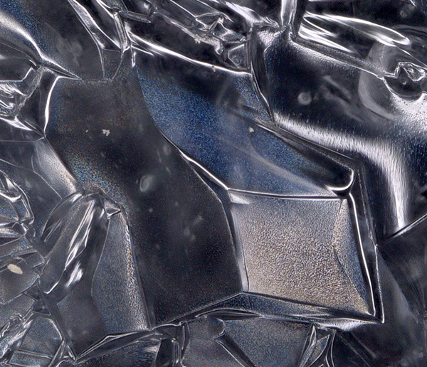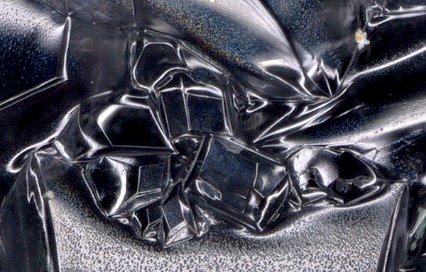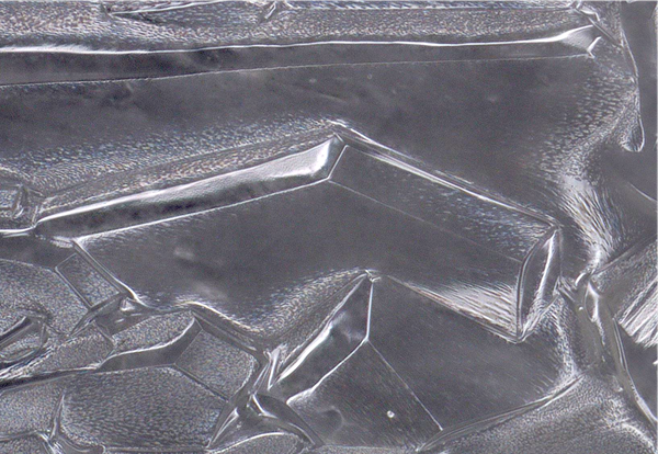 1) The typical symmetrical, flower-petal patterns of the crystals were severely interrupted.