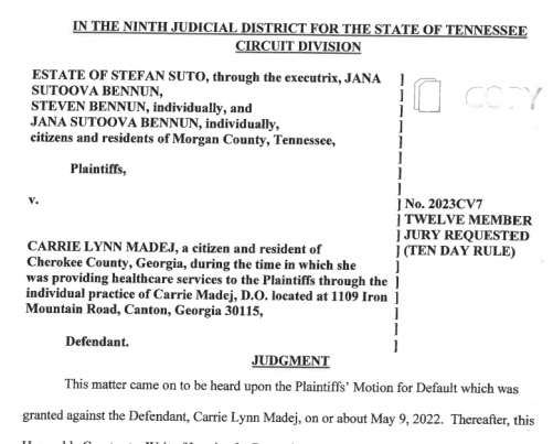 The lawsuit by Suto's heirs alleged negligence and wrongful death. Madej – who surrendered her Georgia medical license in 2023 – never responded to the claims.