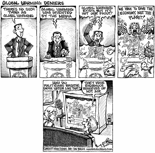 In this cartoon, I decided to show a typical Republican global warming denier altering his statements as the water rises around him. First, it's the blatant denial, "There's no such thing as global warming." Then, as the water level reaches his waist, he proclaims, "Global warming was invented by the media!" As the water level reaches his neck, he shouts, "Global warming exists, but it's not our fault!" (Which means global warming isn't caused by human activity. This is the current defense of the Republican kooks.) And finally, in a mad rage, "We have to save the economy, not the planet!"