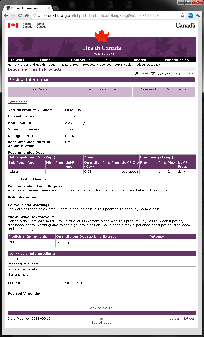 Adya, Inc. appears to have intentionally deceived Health Canada in its application, avoiding any mention of aluminum sulfate (even though it is the second most common in the ingredients, right after iron) and misleading Health Canada about the intended health application of the product.