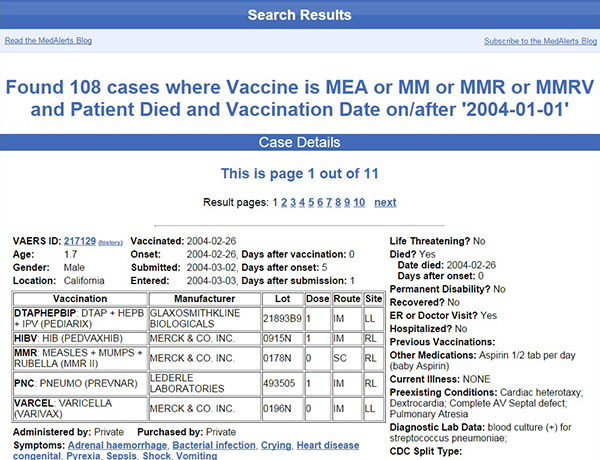 [1]We ran a search for a ten year period for deaths reported with measles vaccines, including a few that are no longer in production. The search result contained 108 deaths over this period, associated with four different measles vaccines sold in the United States during the past 10 years.