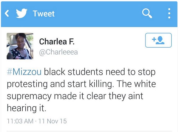 • Black students have begun to send tweets demanding that blacks start killing whites. As this tweet shows, @Charleeea now demands, "#Mizzou black students need to stop protesting and start killing. The white supremacy made it clear they aint hearing it."