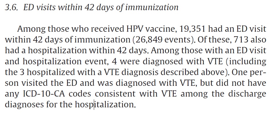As the study clearly states in its results, " Of the women who received HPV vaccine 958 were hospitalized and 19,351 had an [Emergency Department] visit within 42 days of immunization."