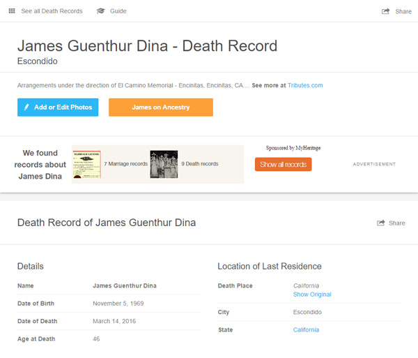 Publicly available death record for James Guenthur Dina: