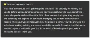 Posting as of late on anything linked to Wikipedia, comes the pleading huckster’s post for you to give him some money, even just a cup of coffee’s worth, so he can continue surviving and “thriving.” Well, if you’re thriving, why beg for $2.75 from everyone? It’s big pharma at work, folks, and if they con everyone out of $2.75, who thinks Wikipedia is real, then the billionaires get richer while the rest of us sink with the Titanic (the complete blackout of useful information on line).