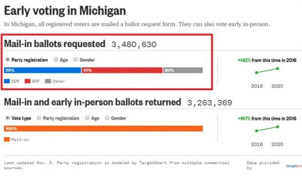 Michigan's results are remarkable considering Republicans actually requested more mail-in ballots than Democrats (41 Republican, 39 Democrat, 20 Other), according to data shared on NBC News.