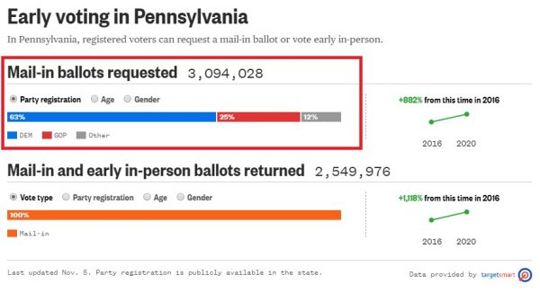This morning, three days after the election, Biden took the lead in Pennsylvania due to mail-in ballots, erasing the nearly 700,000 vote advantage President Trump had after Election Day.