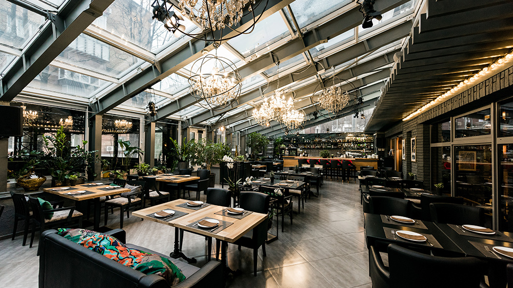 are eating outdoors at his restaurant but not among people outside shopping for clothes right next door.