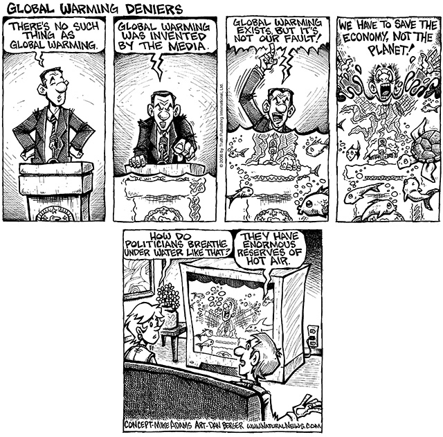 In this cartoon, I decided to show a typical Republican global warming denier altering his statements as the water rises around him. First, it's the blatant denial, "There's no such thing as global warming." Then, as the water level reaches his waist, he proclaims, "Global warming was invented by the media!" As the water level reaches his neck, he shouts, "Global warming exists, but it's not our fault!" (Which means global warming isn't caused by human activity. This is the current defense of the Republican kooks.) And finally, in a mad rage, "We have to save the economy, not the planet!"
