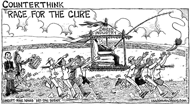 Cancer, you see, is big, big business. And keeping that money flowing requires a global propaganda campaign that holds out a carrot of hope in order to keep all the sheeple running in circles, empting their pockets of cash for the benefit of the drug companies. The scale of this scam is astounding, and that's what I've tried to capture in this cartoon.