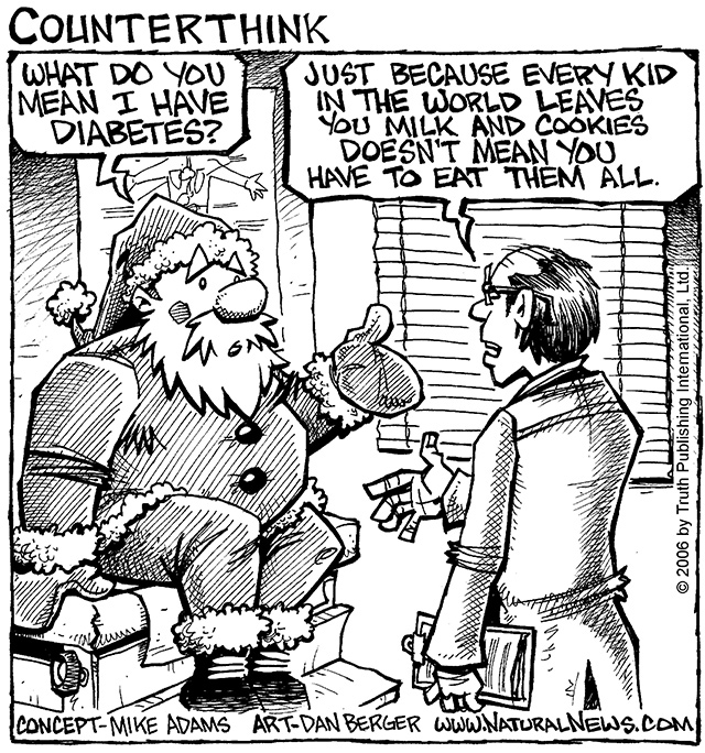 Anyway, as you'll see in subsequent comics, we're pulling together a team of top nutritionists to help Santa overcome his diabetes in time for Christmas. Some additional cartoons will document his progress.
