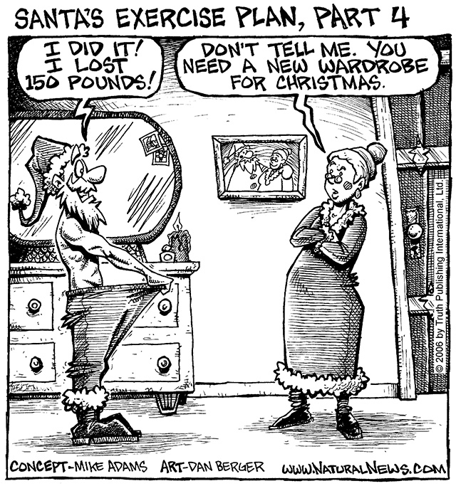It's one of the rewards of losing a substantial amount of body fat -- you get to go out and buy some new clothes that accent your figure! Of course, losing substantial body fat (50 or 100 pounds, for example) takes a lot more than just the few weeks illustrated in these Santa Claus cartoons. When I dropped 50 pounds of body fat, I think it required around six months of daily cardio exercise (about an hour a day) combined with very healthy eating, including a huge salad every day. Aim for losing 1-2 pounds of body fat per week. Anything more than that and you're probably on a crash diet that will likely bounce back and kick you in the ass with rapid weight gain.