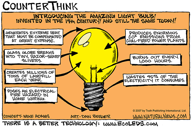 Unfortunately, very little has changed about the light bulb since the turn of the 20th century. The device still wastes 95 percent of the electricity it consumes. And thanks to a deliberate design by manufacturers to encourage repeat sales (i.e. they are deliberately engineered to burn out), light bulbs still burn out after about 1,000 hours, requiring consumers to toss them into the garbage and buy new ones. (It's true: Light bulbs were invented in 1991 that last 60,000 hours, but companies refuse to mass produce them, since repeat sales of light bulbs would plummet. The bulbs sold to consumers today are designed to self-destruct.)